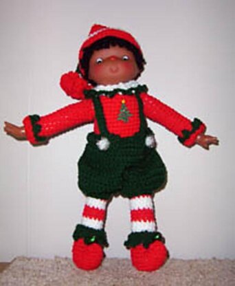 Hollivy the Christmas Elf, to crochet using worsted weight yarn. Requires stuffing, 4 1/2" doll head/hands set and small trims for buttons, or embroider 'buttons'.