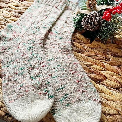The Holly & the Ivy Socks are knit from the toe up with a berry-like stitch on the front of the sock and a lace leaf panel on the front side of each sock representing the ivy.