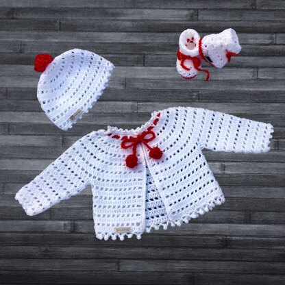 HOLLY BABY CHRISTMAS CARDIGAN HAT & BOOTIES SET PATTERN PDF - An adorable baby Christmas outfit in size 0 - 3 Months. Cardigan and hat are made seamless from top down so no sewing. Booties made in the round bottom up. Crocheted pom-poms will never unravel! Made in any other colors this is a sweet wee everyday baby set and makes a lovely new baby gift.