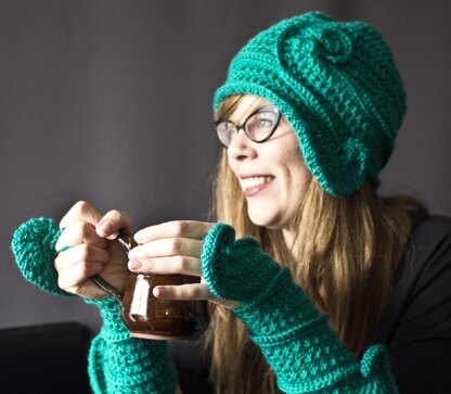 Old Hollywood meets twining vine in this hat and sleeve combo. The cloche-style hat has a bit of a slouchy fit with an art deco accent of a spiralling brim. The matching sleeves employ the same spiral accent and coil their way up your arms. The hat can be knit in two sizes, S-M or M-L, while the sleeves are size-adjustable as you go.