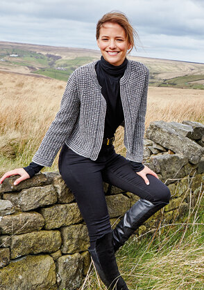 A textured and slightly cropped cardigan designed by Lisa Richardson. It is knitted in two shades of Valley Tweed, a lovely 100% wool yarn made in Yorkshire, the home of Rowan. It features set-in sleeves.