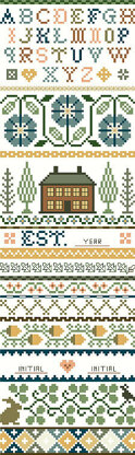 By Deanna Hall West. Kooler Design Studios take on the classic Americana band sampler in a style more sophisticated than primitive. This subtle design by Deanna Hall West has soft tones of gold, green and teal which will fit into today’s décor. A full 18 ¼” long on 14 count fabric when finished.