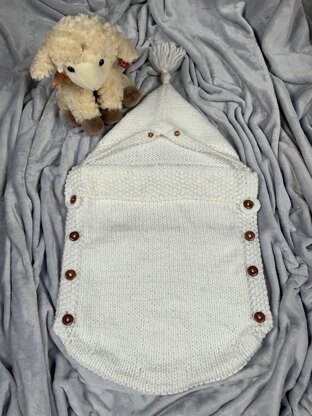 This baby’s sleeping sack / papoose comes in 5 sizes starting at newborn. Knitted in one piece (including button bands), there is only one short seam along the top edge of the hood.