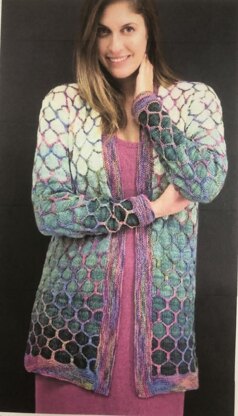 A mosaic looking cardigan/jacket. The gradient colors mixed with a multi contrast color just does the work. All you need to do, is follow the directions and knit it. Shifting contrast engage the eye as it travels from bottom to top, dark to light, changing dimensions along the way.