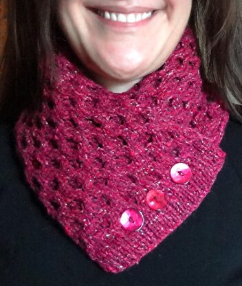 A simple short scarf, worked in Honeycomb stitch. It features a cross-over lapped front which is buttoned in place with 3 shell buttons.