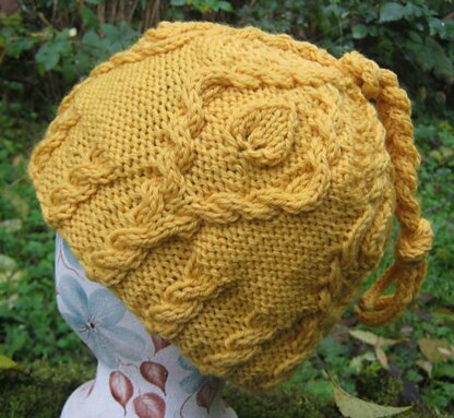 A large flattened bobble is the “honeydrop” inside a cabled diamond on this cap finished off with an I-cord braid. Cap begins with a cabled rib which develops into the diamond pattern.