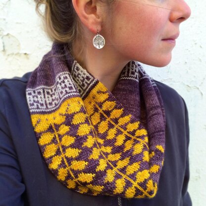 Inspired by the brilliant gold leaves of the honey locust trees lining the streets of downtown Philadelphia, this single-loop cowl features a graduated leaf motif anchored by contrasting decorative borders. This cowl is recommended for experienced stranded knitters who are comfortable reading from charts and knitting in the round. Beginning with a provisional cast-on, the cowl is knit in the round to form a tube, and then the ends are grafted together. The cowl pictured above was created with Madelinetosh Tosh Merino Light in colorways Penumbra, Silver Fox, and Candlewick.