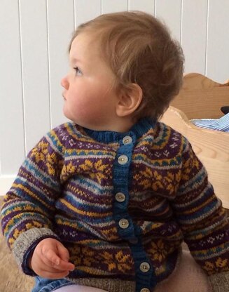 It is a perfect project for leftover yarns. The pattern is designed “as you go”, and there is no overall plan to the pattern borders and the colors. If the colors used in the samples look coordinated, it is because they are remnants from previous project. It is worked around, from the bottom and up, with steek sts in the front, and explanations about how to cut. The yoke decreases with Raglan decrease