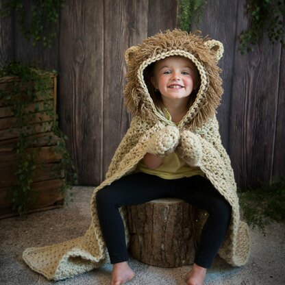 Wrap yourself in this cozy Hooded Lion Blanket. Perfect for cuddling, play and display. Our Lion blanket features a gorgeous textured stitch with a Loopy stitch mane. Mitts with detailed paw prints and tail. Loops can be cut and brushed for a shaggy look. Pattern includes a video tutorial on our webpage!