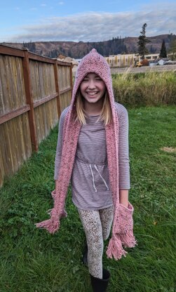As written, this hooded scarf fits heights up to approximately 5'9". Basic modification instructions are included for adjusting the length of the scarf and the depth of the hood. Finished size as written is approximately 60" by 8.5" wide. I used City Tweed Aran yarn, but you can use any worsted/aran weight yarn you'd like and a size I crochet hook. Optional pockets to keep your fingers warm, though I prefer to wrap the scarf ends around my neck - so cozy!