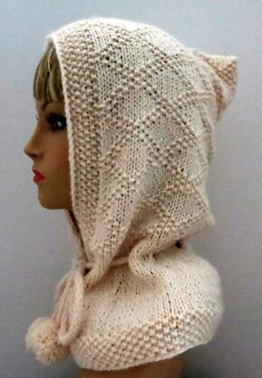 The pattern is in written form with instructions for knitting and assembly of the hood. There is only one seam. Instructions are included for knitting an I-cord. There is a bonus section that provides knitting instructions for increasing and decreasing the finished size.