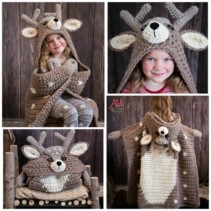 Be Kind like the Deer! Wrap yourself in this cozy Hooded Deer blanket. Perfect for cuddling, play and display. Our Deer blanket features a tail graphed into the back of blanket and spots, hoof mittens and detailed Deer hood. When not in use the blanket folds into a little pillow. Video accompaniment is provided but must be purchased separately from www.mjsoffthehookdesigns.com (use coupon code provided in the pattern)