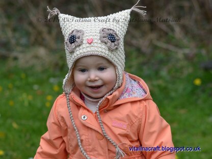 The hat is fancy and easy to knit. This hat is knitted with cream color cotton yarn in the round so it has no sew on the back. It is decorated with contrast knitted edge and knitted owl eyes at the front and black polka dot buttons in their centers. The earflaps will keep you or your little one warm and cozy these spring days.