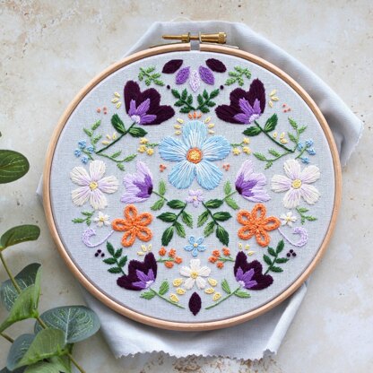 Stitch up this beautifully intricate floral design, (which looks a lot harder than it is, I promise).\n\nThis download is great for winding down to some mindful crafting after a long day whilst adding a splash of modern embroidery to your home décor.\n\nStretch your skills with a range of 9 stitch, with every stitch explained in detail it makes a perfect beginner project although some experience would be recommended for this project.\n\nThe digital download also full to the brim with lots of top tips and how to’s to help you on your way if you are a complete beginner.\n\nComplete this project using a 17cm/ 7 inch embroidery hoop to display, or add the designs to a tote bag, jacket, dress, or anything else you can think of make it that little bit more special. \n\nFor personal use only – Do not resell, distribute, or recreate this pattern in any way. You are not permitted to sell a finished embroidery piece in any format from this pattern – but you are allowed to gift it!
