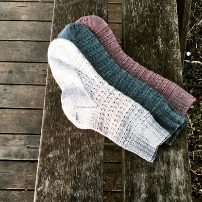 Knit a sock to wear with your summer clog, or coming out from the top of your boot or sneaker. In a tonal sock yarn this easy stitch pattern looks almost embroidered. The socks are knitted top down with a traditional slip stitch heel flap and gusset, which suits the stitch pattern well. The suggested yarns are plump and smooth sock weight yarns that feels almost like cotton.