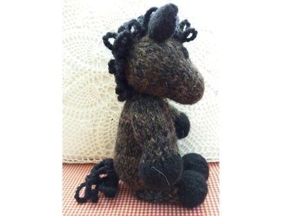 The horse is fairly easy. You can choose to make it all in one color, change the color of just the mane and tail, or add patches and other markings using duplicate stitch on the body, head, and legs. You can also choose between crochet chain loop or fringe stitches for the mane.