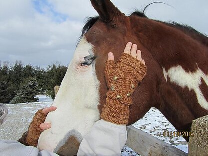 Description: My sister wanted a pair of fingerless mitts after all her nieces and nephews got pairs for Christmas, and because of her love of horses I was inspired to make her a pair to reflect this passion. The cuffs and tops of the mitts represent fencing and the centers each have a cabled horseshoe motif accented with purchased buttons. They are knitted in the round and are pretty easy, requiring only some familiarity with knitting in the round on sock needles (DP's or magic loop or two circulars) and some simple cabling techniques. Pattern in written form only. Finished size: These will fit most women's hands. They are average in size, but there is enough stretch to accommodate a larger woman's hands.