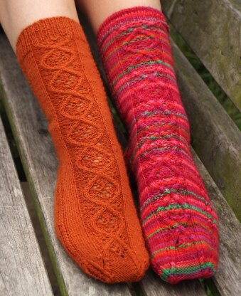 I've listed the two yarns that I did samples in but this pattern will work in any standard sock yarn - approx 400m/100g.