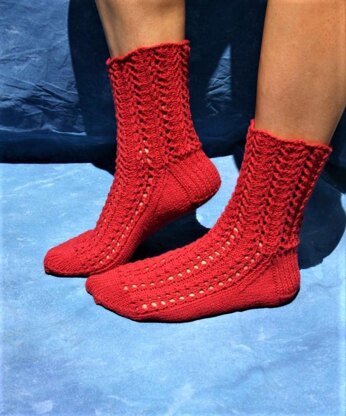 The socks’ construction is traditional, even if the socks themselves are not. Knitted from the top down, they feature a slip stitch heel flap and shaped gusset that fits nicely on your heel. The sole and toe of the socks are smooth stockinette, so it’s smooth and comfortable inside the shoe, while the lace pattern continues down the top of the sock for maximum sauciness.