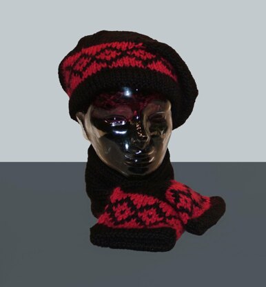 Looking to warm up? How about some Hot Scotch? This hat and scarf set will knit up quickly in a bulky alpaca that is sinfully soft, giving the modified beret a beautiful drape. A fair-isle band gives the hat posture: it drapes rather than slouches. The bands are easy two-color stranded knitting, a great introduction to the art of fair isle knitting. Because the fair isle band looks the same both upside down and right-side up, the scarf is seamlessly constructed as a tube. Pull one end of the scarf through a slit in the tube, and you have a polished pulled-together look.