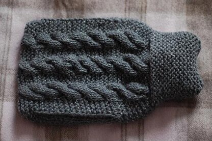 This hot water bottle cover has a convenient pocket to keep your hands toasty. Simple cables wind up both the back and front, and end in an unfussy fold-over top. Tweed yarn gives it a rustic and masculine look, but the pattern would work just as well in a solid colour aran yarn, as a gift for a lady. This is a quick and easy knit that is genuinely useful to everyone, for keeping warm at night, easing aches, or even just for some comforting. The pattern is designed to fit a hot water bottle 19cm x 30cm, but can easily be adapted to suit larger or smaller bottles.
