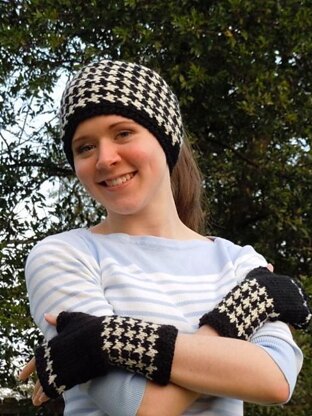 This Houndstooth Set features the classic houndstooth pattern in 3 designs -- Fingerless Gloves, Headband/Cowl/Ear Warmer and Stocking Cap. The Fingerless Gloves and Headband/Ear Warmer are written in one size with suggestions on how to make smaller or larger by changing needle sizes or working more repeats. The Stocking Cap is written in sizes small, medium and large. The gauge for all pieces is 18 sts and 24 rows in Stockinette Stitch on size US7 needles. The pattern calls for worsted weight yarn and takes 295-315 yards of Main Color and 120-135 yards of Contrasting Color to make all 3 pieces.