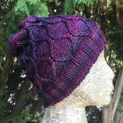 Traveling stitches depict an hourglass shape across a purl background on this fun hat. The purl fabric truly allows variegated and color shifting yarns to shine through.