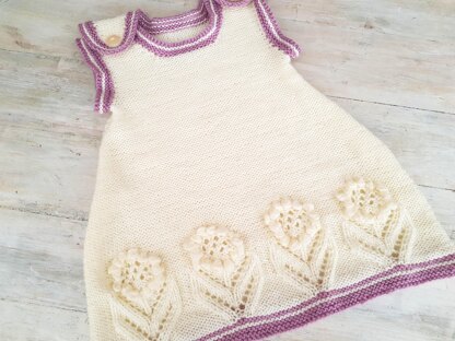 How Does Your Garden Grow? The flowers on this sleeveless dress will grow quite quickly and will always be in bloom. A cute A-Line Dress in Reverse Stockinette stitch with Garter hems and bands in a contrast colour. This is a flat knit pattern, but I include suggestions on how to knit it in the round. A lovely summer dress that you can keep on wearing in the cooler weather, just add an under layer top and some tights. Try different colour combinations to get you own unique look. Sizes: To fit 6-12 months, 12- 24 months, 2-3 years, 3-4 years, 4-5 years Approx. chest of 18 - 20 - 22 - 24 – 26 " or 46 – 51 – 56 – 61 - 66 cm Materials DK Yarn Main colour 200- 200- 200- 300- 300 g ( about 340 yds or 310 m per 100 g) Contrast colour 100- 100- 100- 100- 100 g Yarn Suggestion :King Cole Baby Comfort DK Knitting needles: 3.25 mm (US 3) circular and 4 mm (US 6) single point spare needle or stitch holders Two 16 mm (5/8 ") buttons