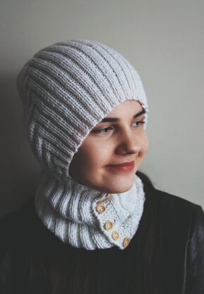 Single-layer rounded balaclava in DK weight with a clean domed crown and ribbed front-button neck piece. Knit flat throughout — no circular knitting required.