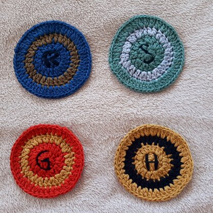 The pattern is for Harry Potter/Hogwarts house colours inspired coasters. The coasters are 13 cm in diameter, perfect for a mug to sit snuggly on it.
