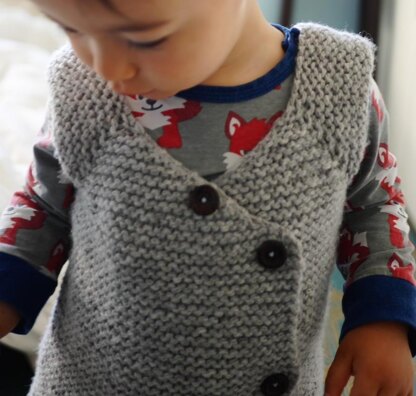 Huddle is a simple vest with a traditional look with a modern twist. It looks equally good on boys and girls. It is worked entirely in garter stitch. It features a kimono front, making it easy to put on and off even on a sleeping baby. The extra layer in the front keeps the tummy warm. It is worked from the top down; you can easily adjust the length to your liking.