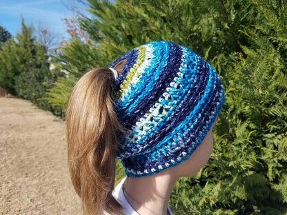This hat works up quickly. I used an I, 5.5mm US hook with I Love This Yarn. Any #4 medium worsted weight yarn should work. The finished hat measures 7.5" but you can adjust the length to fit your needs.