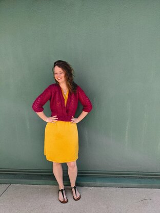 Though mostly knit flat for the neckline, the Huntington is a pullover and designed to layer on top of most shirts and dresses. The surplice neckline starts immediately after the ribbing, though it can be tacked together at the top if you'd prefer.