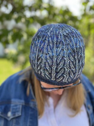 Worked in two colors of your favorite fingering or sport weight yarn, Hythe starts with a 1x1 ribbed brim and moves smoothly into the tree trunk brioche motif. The motif flows smoothly through the crown shaping, allowing the tree trunks to, seemingly, converge. The two-color tree trunk motif yields a geometrical motif on the “wrong side,” plus, the tubular cast-on means the hat look great no matter which side you choose. Match your hat to your outfit, your surroundings, or your mood!