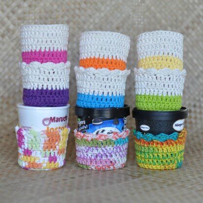 This wonderful little cozy will keep your fingers free from frostbite AND burns, looking super cute the whole time! The 16 oz. Cozy will fit almost every ice cream pint made! Plus, the 14 oz. Cozy will fit the smaller ice cream containers AND your Cup 'o Soup! Win ^_^