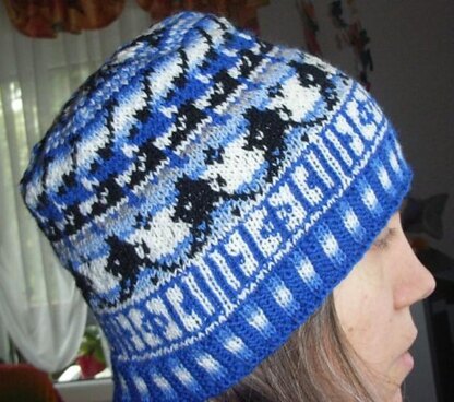 This ice hockey beanie is the result of a pattern request for a kid's ice hockey beanie for boys and girls. I used three shades of blue, offwhite, two greys and black. The colors should be clearly distinguishable from each other otherwise the charts (e.g. the ice skates) won't come out that well. The beanie starts with a corrugated ribbing. Then comes the ice hockey field, followed by a band of ice hockey players. Above are ice skates, hockey stick and puck. At the top are 7 more tiny ice hockey players.