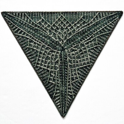 The Ice Mountain Triangle pattern is worked in-the-round from the center out and creates a single equilateral triangle with an original two-colored brioche cabled stitch motif.