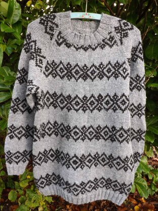 This is a sweater/pullover knitted from the bottom edge and up with two-color stripes and raglan sleeves. The Sweater has a traditional two-color pattern and rib edges. The pattern is made for at yarn with a gauge of 18 stitches per 10 centimeters (two-color pattern). Pictured in Sandnes Peer Gynt yarn.