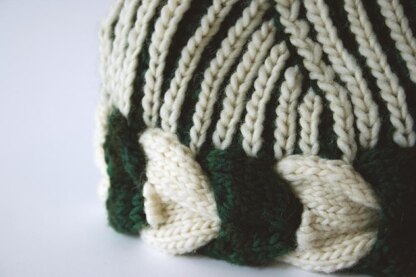 The two-color brioche cap is knit by picking up stitches along the top edge of the finished brim braid. Pick up with the CC (Natural) and then work the setup row in MC (Evergreen).