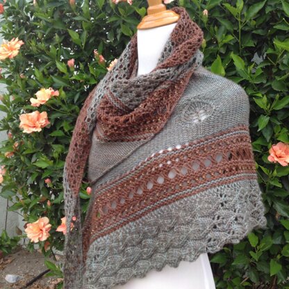 This is an asymmetrical shawl in DK weight yarn, Sport and Fingering also suitable for smaller size. Techniques used in this pattern include creating stitches along side of lace border edge eliminating the need to pick up and knit stitches (this is a fun technique that adds to the design); A twisted wrap stitch; Front and Back Cross stitches, aka Traveling stitches; Attaching beads; Motif and Lace work. Below you will find links to some of these techniques. Pattern includes 336 6/0 glass beads Myuki #F463k. Beads will be applied on both colors. If you don’t wish to include beads, just knit that stitch. I am a tight knitter so please do gauge or buy extra yarn. Group Hands On Knitting CenterVideo tutorials; Creating stitches along lace edging; https://www.youtube.com/watch?v=OLUexQGhZE0 Twisted wrap stitch; https://www.youtube.com/watch?v=j8YzlRzqsfI Working Back cross and Front cross stitches without a cable needle (traveling stitches); https://www.youtube.com/watch?v=aqFGgIgETN0
