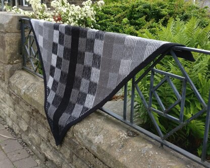 Illustriation appears to have several shades of grey but only uses four different yarns. Anyone looking straight at the shawl will see wide bands of colour which are made up of narrow stripes. As the wearer turns a checkerboard effect comes in and out of view. The viewer will see something different from every angle.