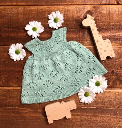 Imogen Jane has a rich lace yoke and full ball gown princess skirt. As your baby grows, this will grow from a dress to a tunic and a nice wide head opening at the neck. Top down design with a pretty lace pattern on the yoke and skirt. The yoke and body are charted and written out.