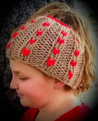 A cute beanie--adorned with heart-like embroidery stitches--works up fast by using big needles and worsted weight yarn held doubled. The red-trimmed ponytail port requires no shaping. Wear it yourself on Valentine’s Day--or make it for someone you love.