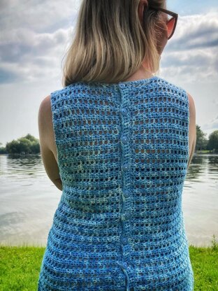 This top is worked in one piece starting from the front hem, with immediate increases to create a circle hem and hip shaping. It decreases at the waist and then again for the armholes. The stitch pattern switches to lace openwork at your desired height for chest coverage. Once the neckline is reached, the work continues seamlessly over one shoulder and down half of the back, following the curves of the front with matching increases and decreases. The other shoulder and back are worked in mirror image, then button bands are picked up. Lastly, the sides are seamed and buttons attached up the spine.