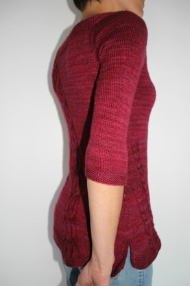 The sweater is knitted from top down seamlessly. A nice cable across the back. Two cable on the side of the front. 3/4 sleeve. Perfect for early fall !