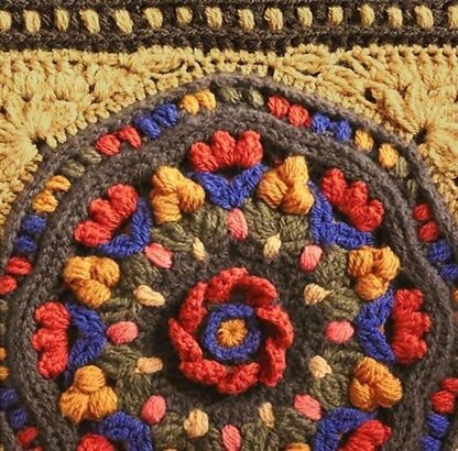 The size after blocking is 10”X10”/33x33 cm. The model is made with Sheepjes Colour Crafter yarn. It can be made in Stylecraft Special Dk since both threads have the same elasticity and gauge. Other yarns with similar characteristics are Studio Essential by Deramores, Astra by Patons, Elle Family Knit DK and Emu Clasic DK. If you want to work with cotton, Muskad and Safron of the brands Drops is a good option, however, the elasticity is slightly lower, so –depending on your tension– sometimes you will have to add one or two chains