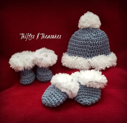 100% crocheted (even the little pom!) and no sewing (except for the little pom ), this set includes 2 hat sizes, 2 mitts sizes, and 3 boots sizes, for infants 0-12 mos.