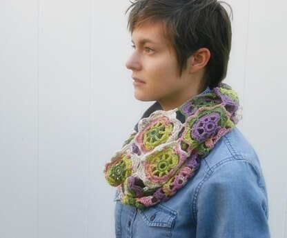 The flower motif is simple, yet elegant. And the soft drape of the yarn makes for a lightweight yet cozy accessory.