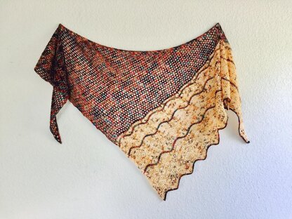 The scarf starts out with the first yarn color and a few stitches, and expands slowly with a very easy two-row repeat. One edge increases while the other edge makes a slight decrease forming a modified boomerang shape. Then, at a specific width, you change to your coordinating second color of yarn and you start crocheting the feather and fan section. Again, it’s an easy two-row repeat, and you will add in four accent rows with your first yarn color.
