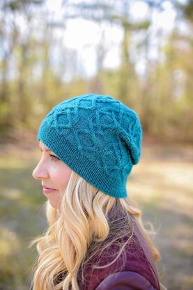 From two to one to two again, these cables stay true to each other and themselves. Each strand faithfully returns to its beginnings after exploring the expanse around it for a time. This slouchy hat is worked from the bottom up in the round. Flip the brim for a beanie fit. Cable work is charted. Pattern is recommended for knitters with prior experience cabling. Shown in Small featuring Magpie Fibers Swanky Sock in colorway Tidepool.